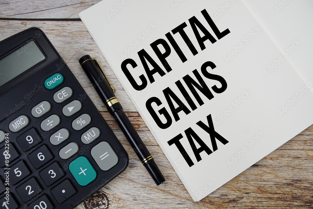 Capital gains tax text message written on note page with calculator top view on wooden background
