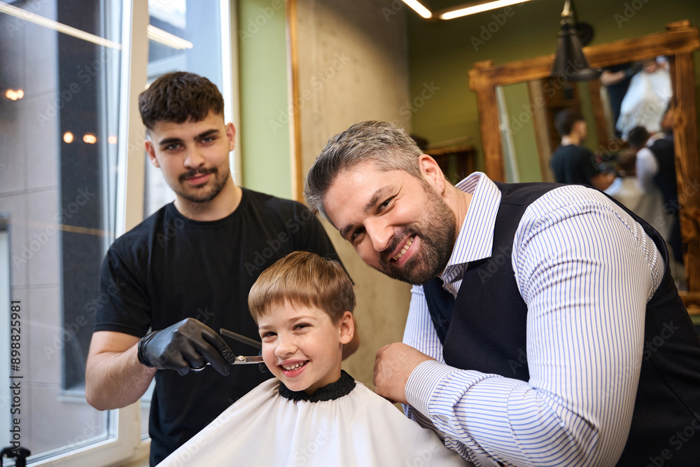 Bearded experienced barber making stylish haircut to small boy client