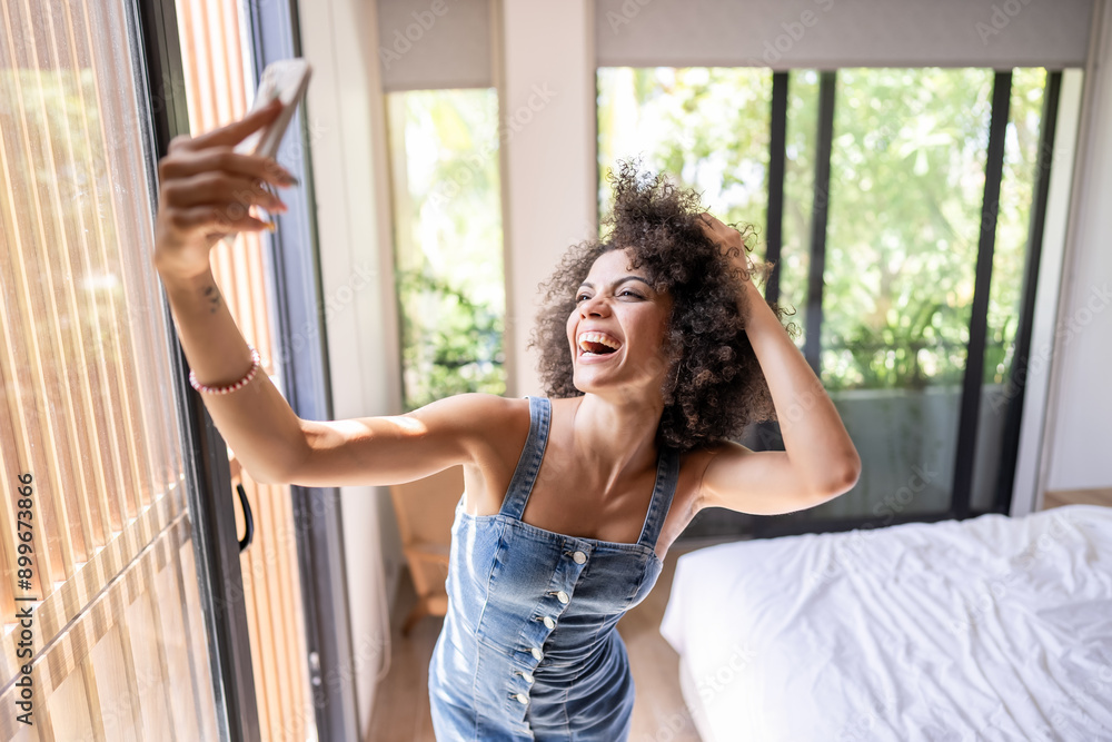 Young cheerful woman of African descent standing near a big sunlit window of a hotel room, taking a selfie using her smartphone. Travel concept.