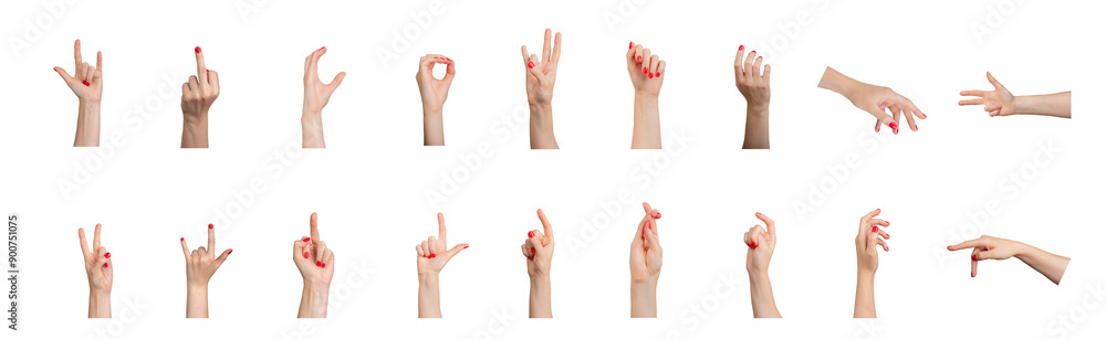 Hands showing different gestures, signs with fingers, red nails isolated on white background.., transparent PNG