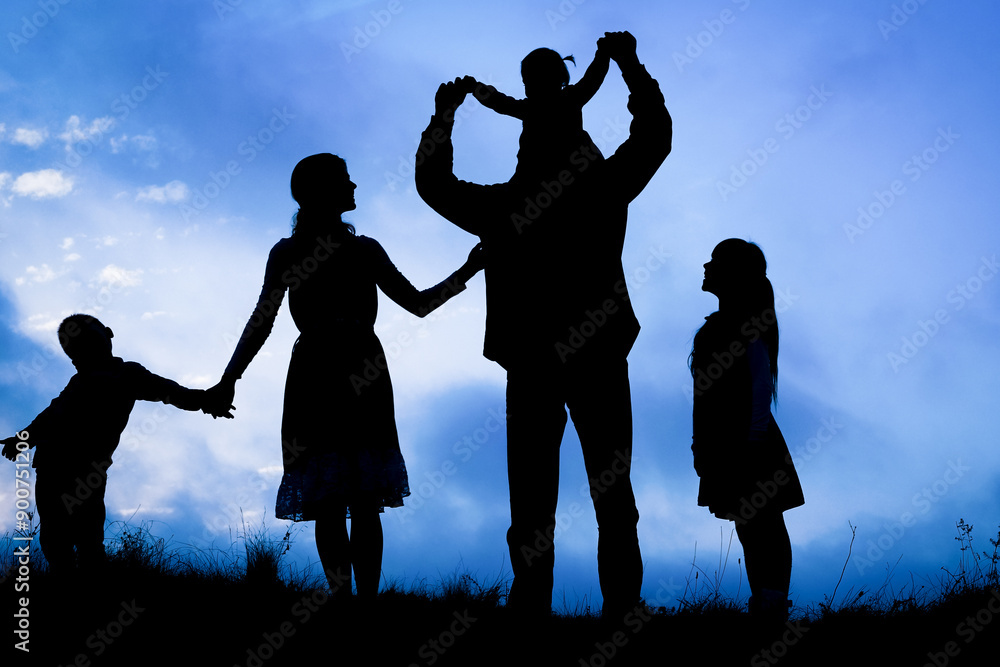 happy family by the sea on nature silhouette background