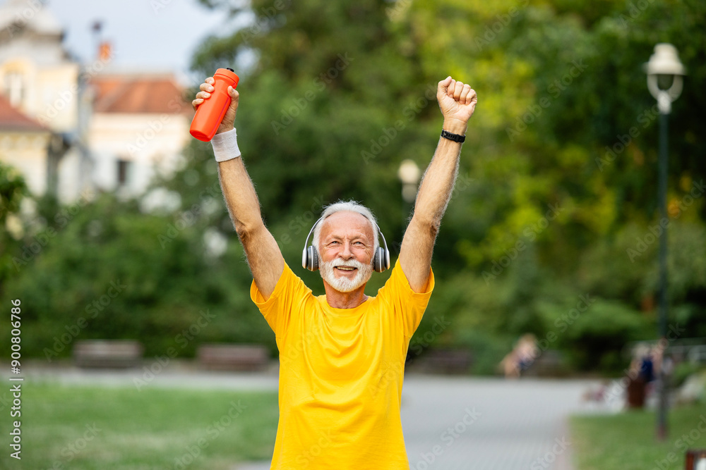 Senior runner holding hands in the air feeling happy after the training.