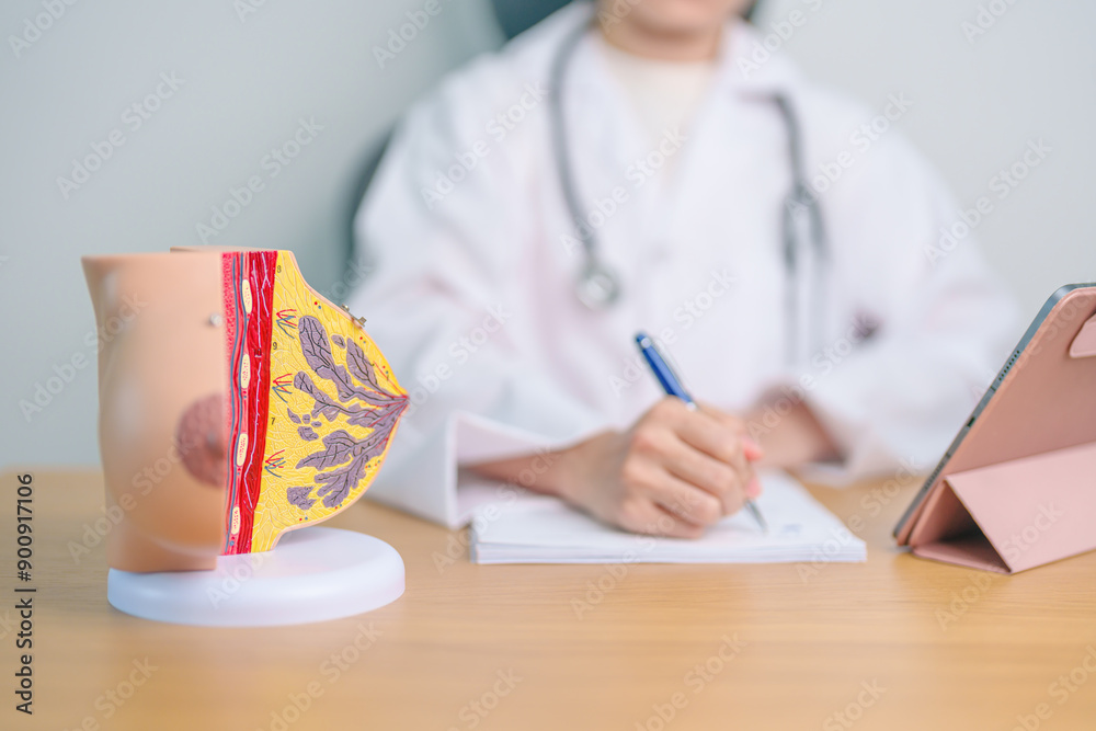 Doctor with Breast Anatomy model. Breast Augmentation Surgery, October Breast Cancer Awareness month, implant, Diagnosis, Beauty woman enlargement and medical education concept
