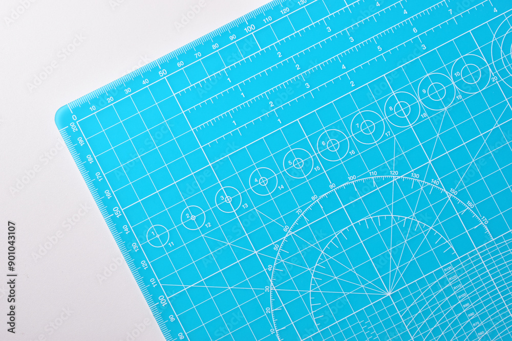 blue cutting mat board on white background with line and scale measure guide pattern for object art design, tool equipment of diy craft work