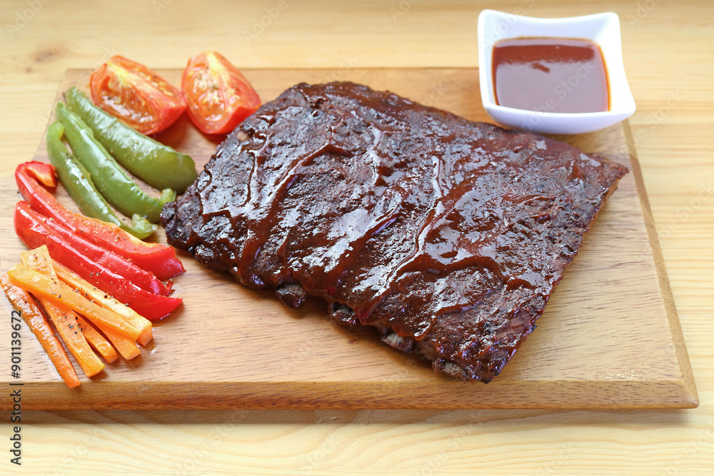 Delectable BBQ Pork Ribs with Grilled Vegetables on a Cutting Board