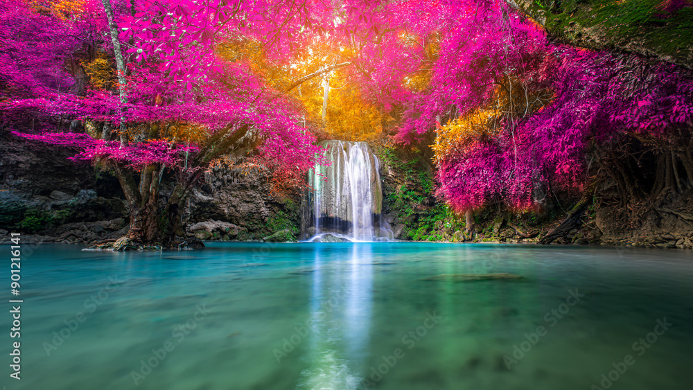 Amazing in nature, beautiful waterfall at colorful autumn forest in fall season