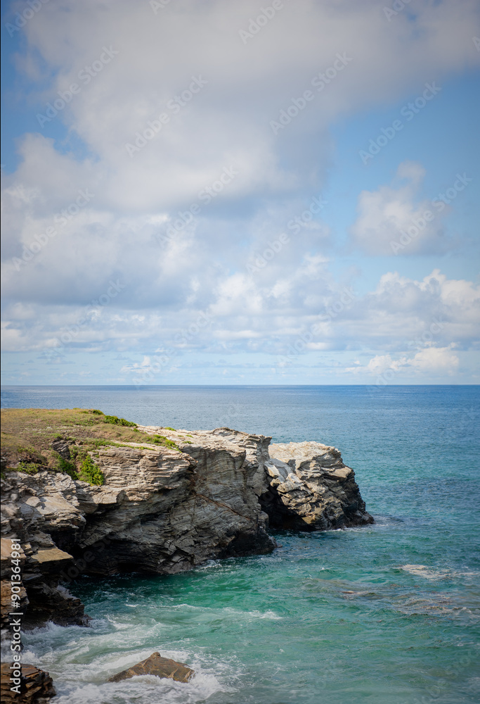 aerial view of famous beach in Northern Spain in the sunset light, Cathedrals beach at the Atlantic Ocean, Cantabric coast Lugo, Galicia, Spain - Playa de las Catedrales