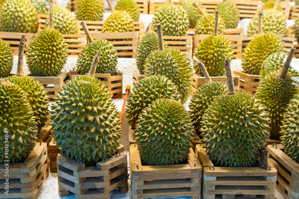Fresh tropical durian fruits displayed at a market stall. Colorful display of exotic Durio zibethinus fruits at Phuket market, Thailand