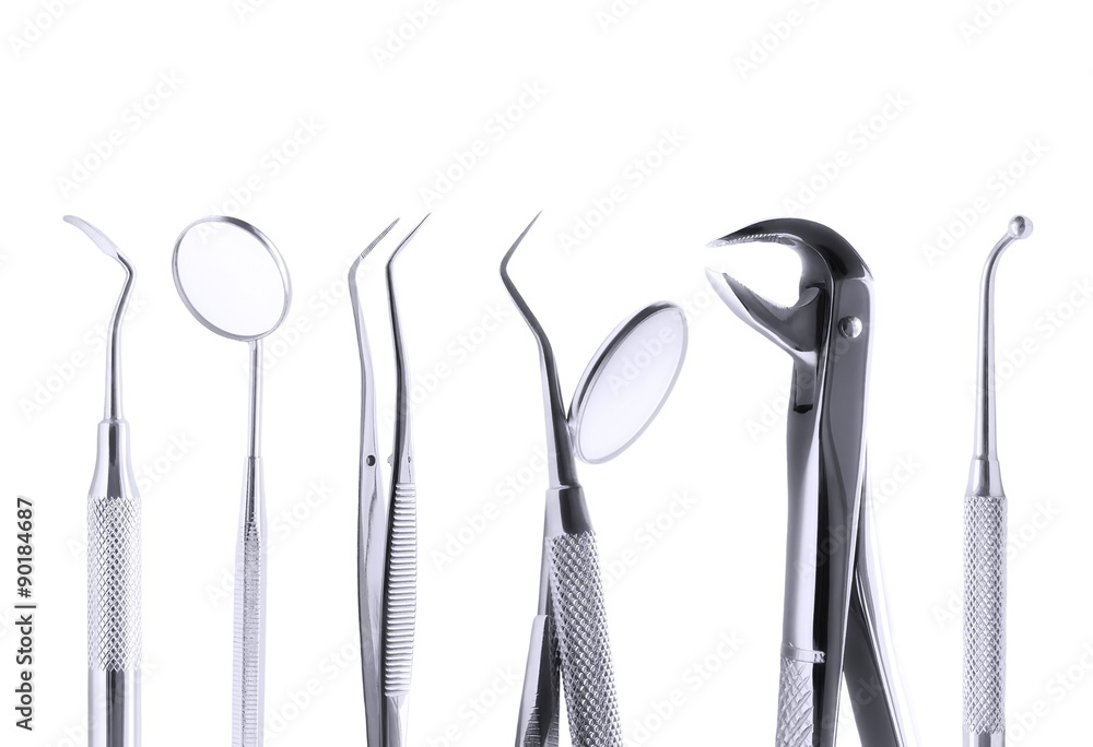 Set of metal medical equipment tools for teeth dental care isolated on white, with clipping path