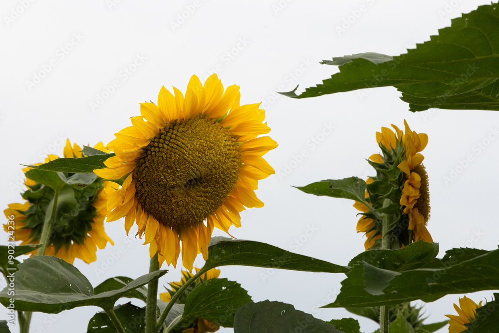 closeup of sunflower blooms and broad green leaves with a blank white background