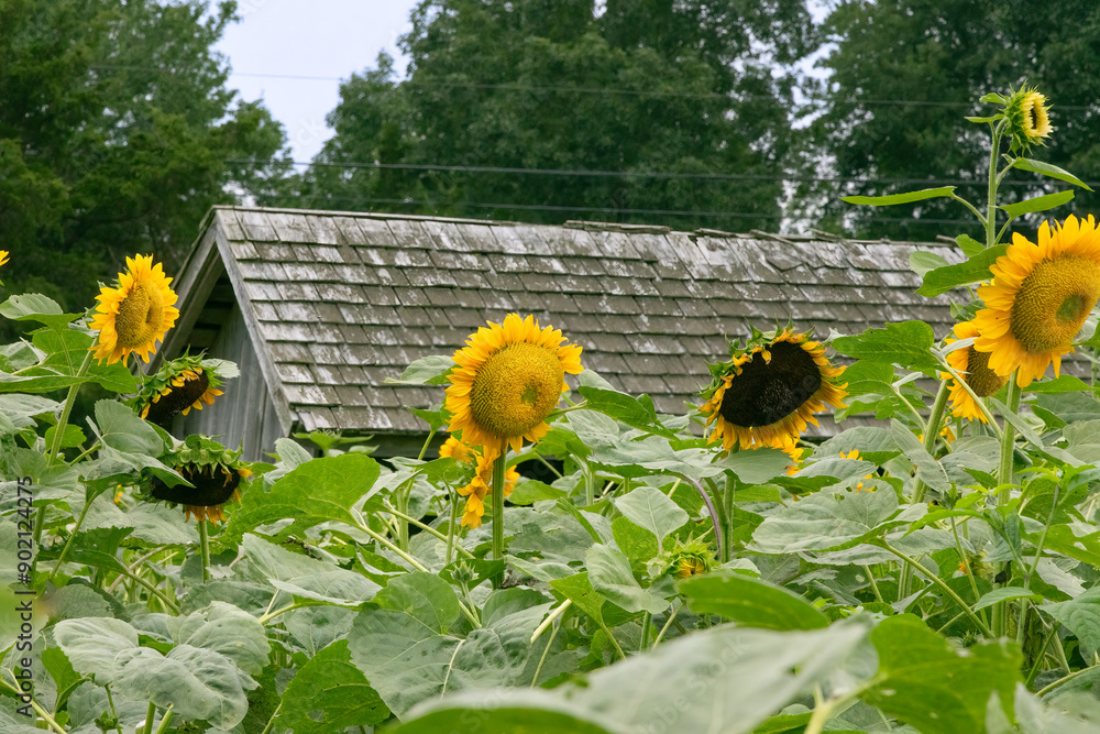 Sunflowers bloom in a field with a wood-shingled shed and trees in the background.