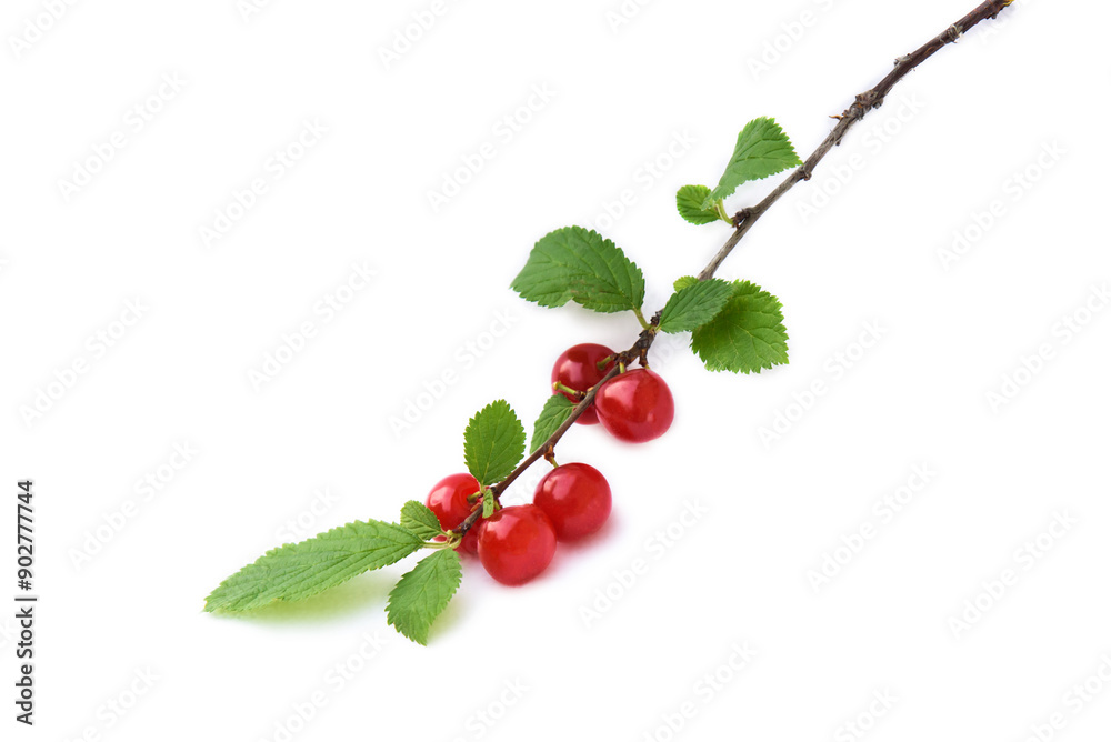 Red ripe cherry berries on a branch with green leaves. The cherry branch is isolated on a white background