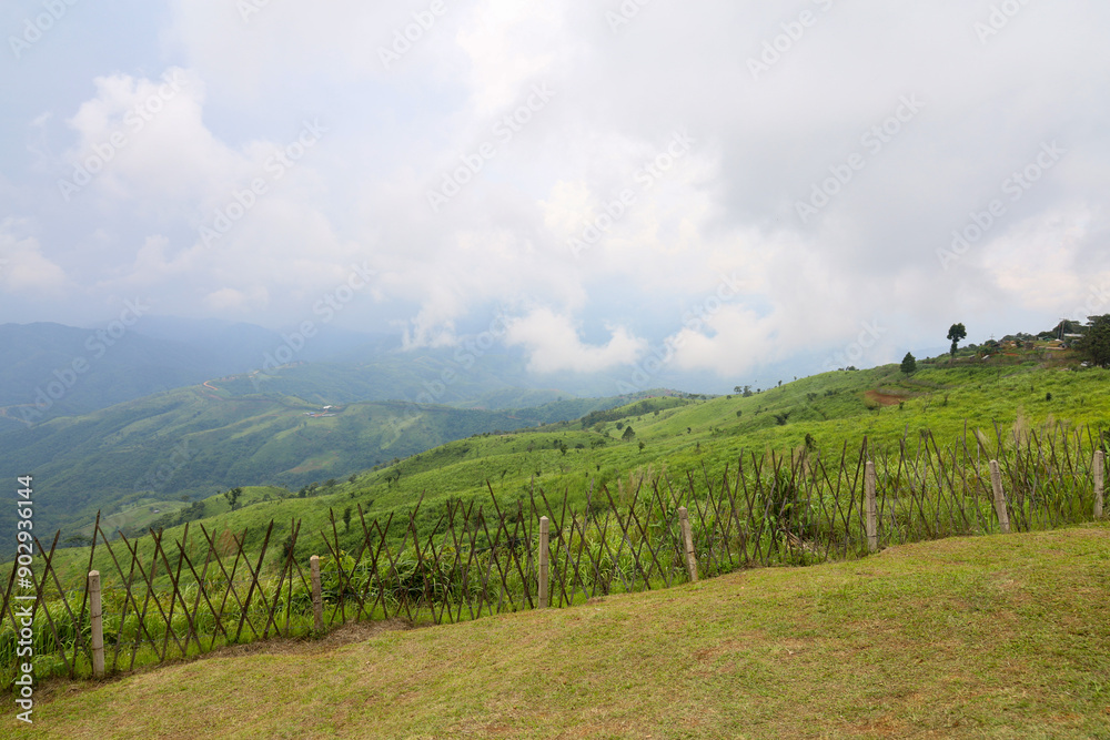 view of landscape is green grass on nature mountain in rainny season at thailand
