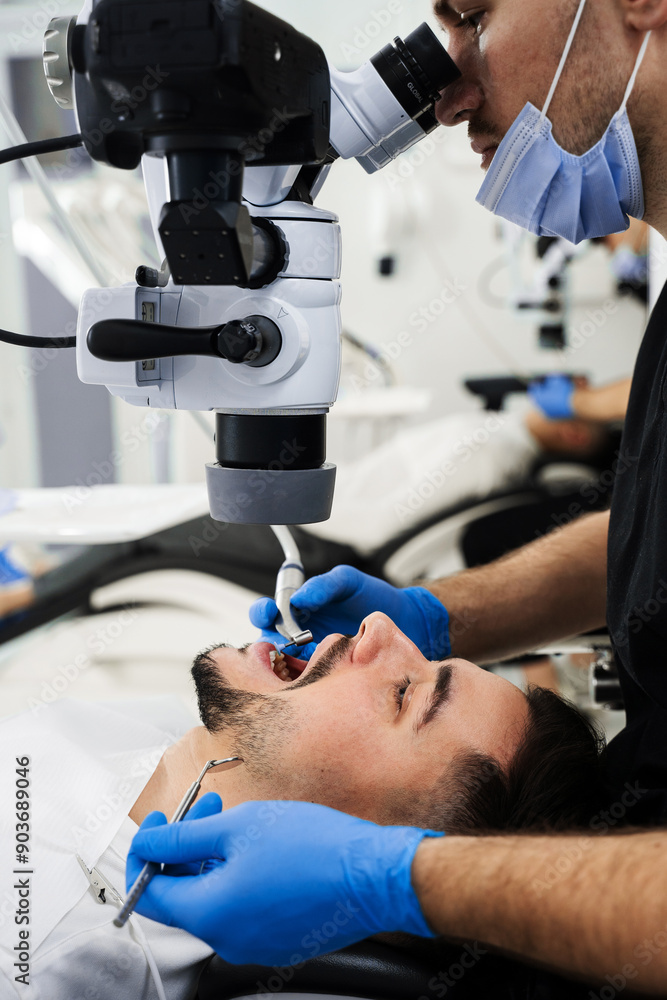 Polishing teeth with digital microscope in stomatology clinic. Digital microscope diagnostic by dentist.