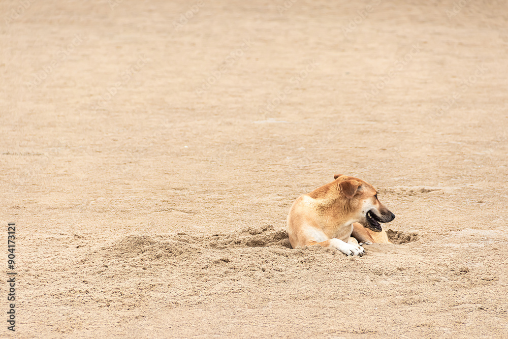 Brown dog relaxing and sleeping on sand beach.