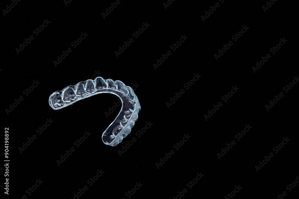 Clear mouth guard on black background with font, art, fashion, metal keywords