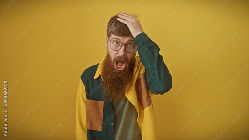 A shocked redhead bearded man in a colorful shirt expressing surprise against a yellow background.