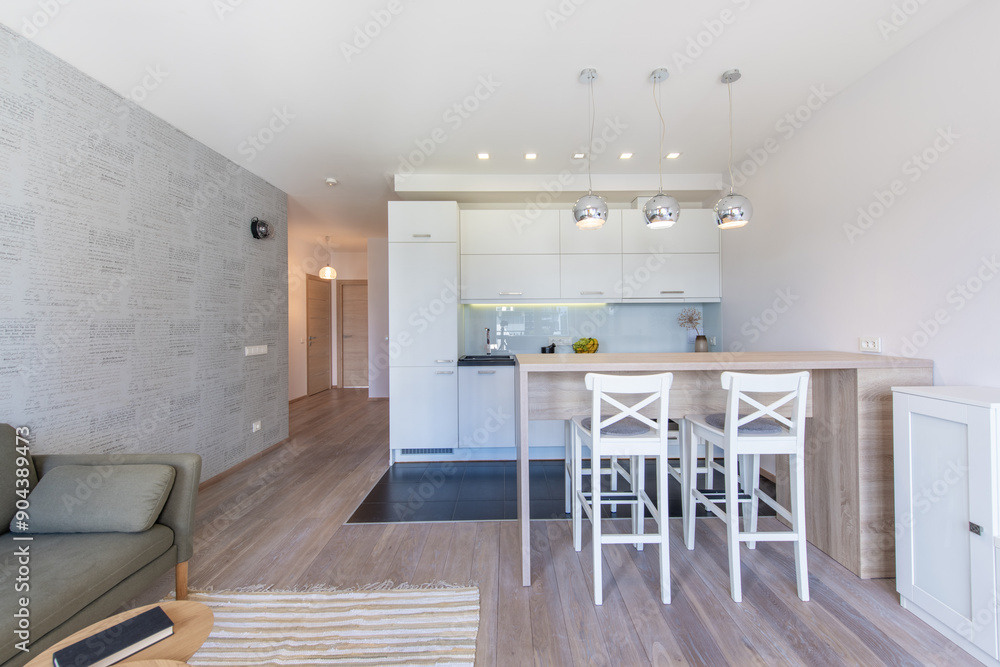 Modern Home Living Room and Kitchen Interior. Luxurious Stylish Modern Apartment. Open Interior, Stylish Sofa, White Furniture, Scandinavian Design