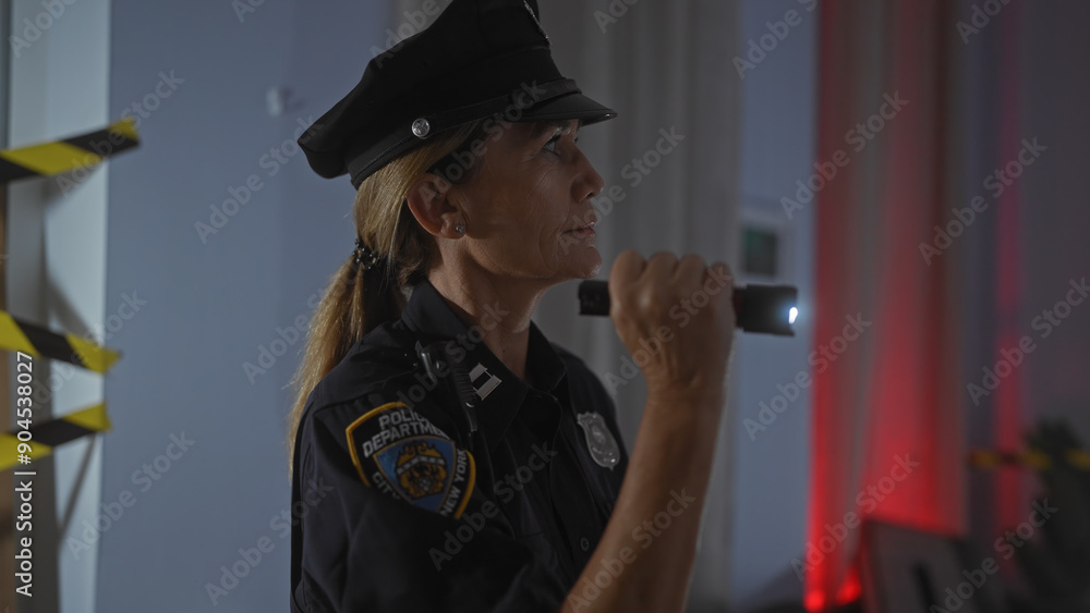Caucasian woman police officer investigating a dimly lit indoor crime scene with flashlight