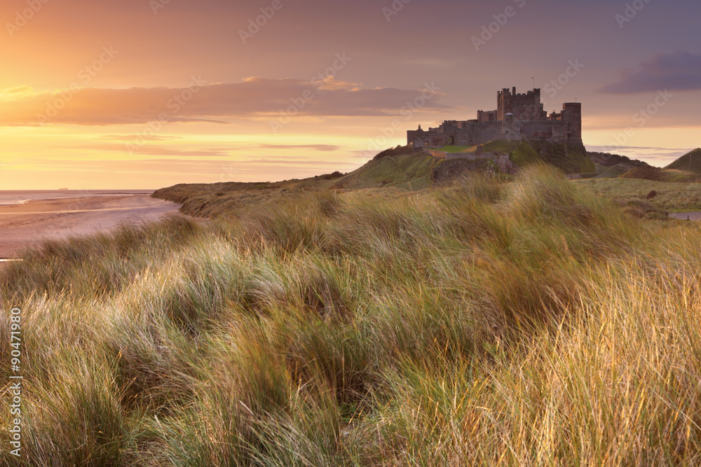 Sunrise over Bamburgh Castle, Northumberland, England.