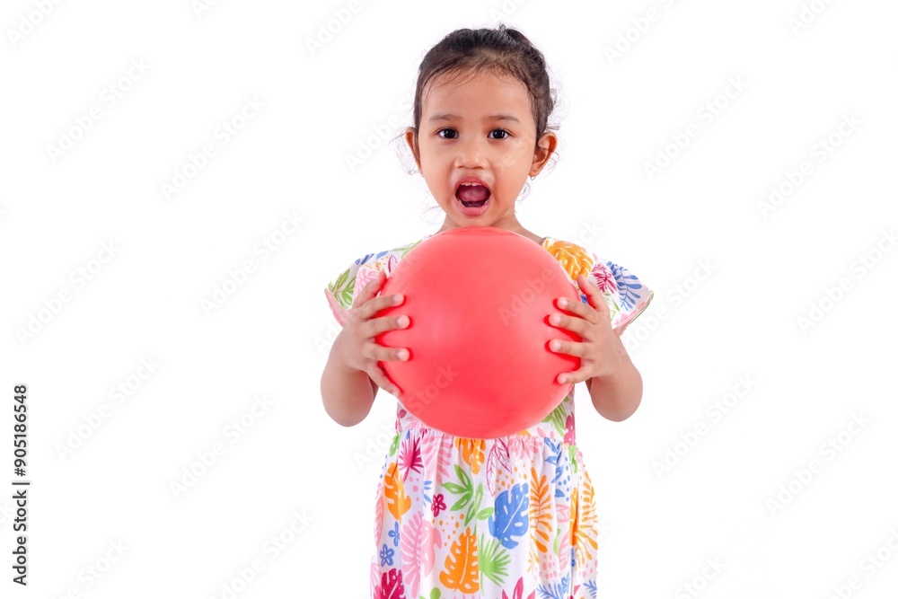A cheerful little Asian girl in a colorful dress holding a red ball or balloon with both hands on a white background