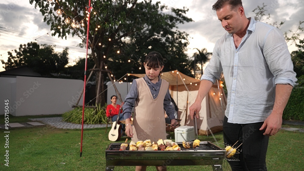 Family together camp in garden, father and child grill food for family member. Outdoor camping activity to relax with tasty meal and spend time with young generation cross generation gap. Divergence.