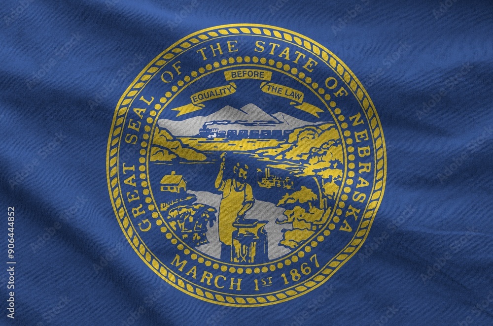 Nebraska US state flag depicted on folded wavy fabric of old cloth close up