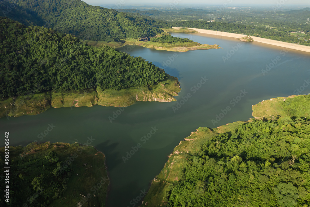 Tranquil river meanders through verdant hills under the gentle watch of a cloud-speckled sky