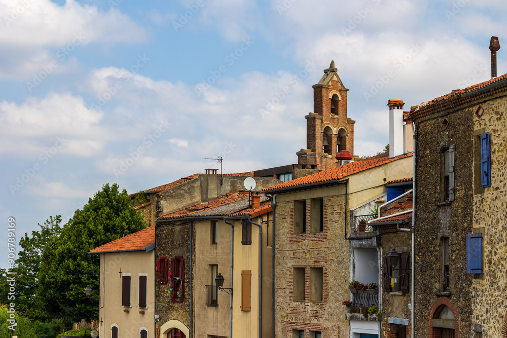 Clocher-mur de l’église Notre-Dame émergeant au dessus des maisons du petit village de Carla-Bayle
