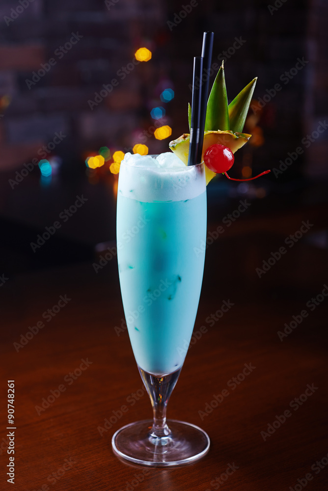 tropical blue curacao alcoholic cocktail garnished with a fresh pineapple slice and maraschino cherries on a table in the restaurant with bright backgrounds of beautiful disco lights.