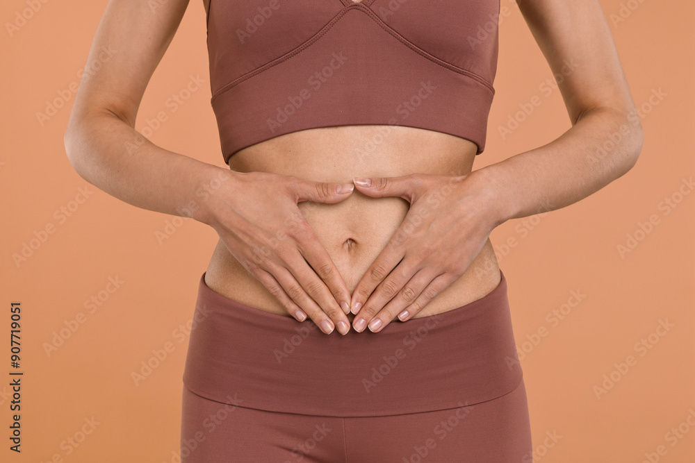 Healthy digestion. Woman making heart shape with hands near her belly on beige background, closeup