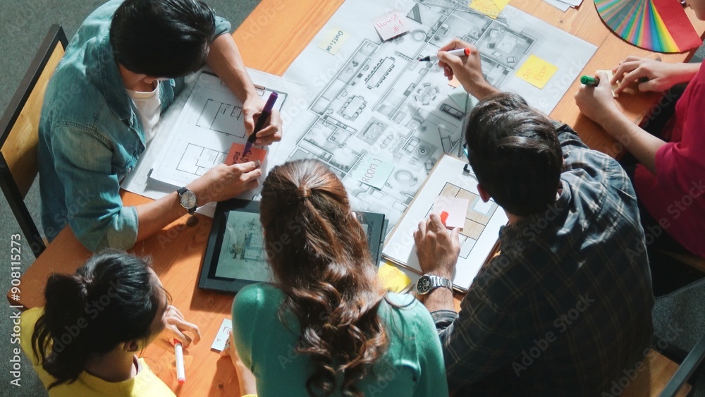 Professional civil engineer handed document while looking at blueprints. Skilled architect team brainstorming idea and planning building design while sitting at meeting table with plans. Symposium.