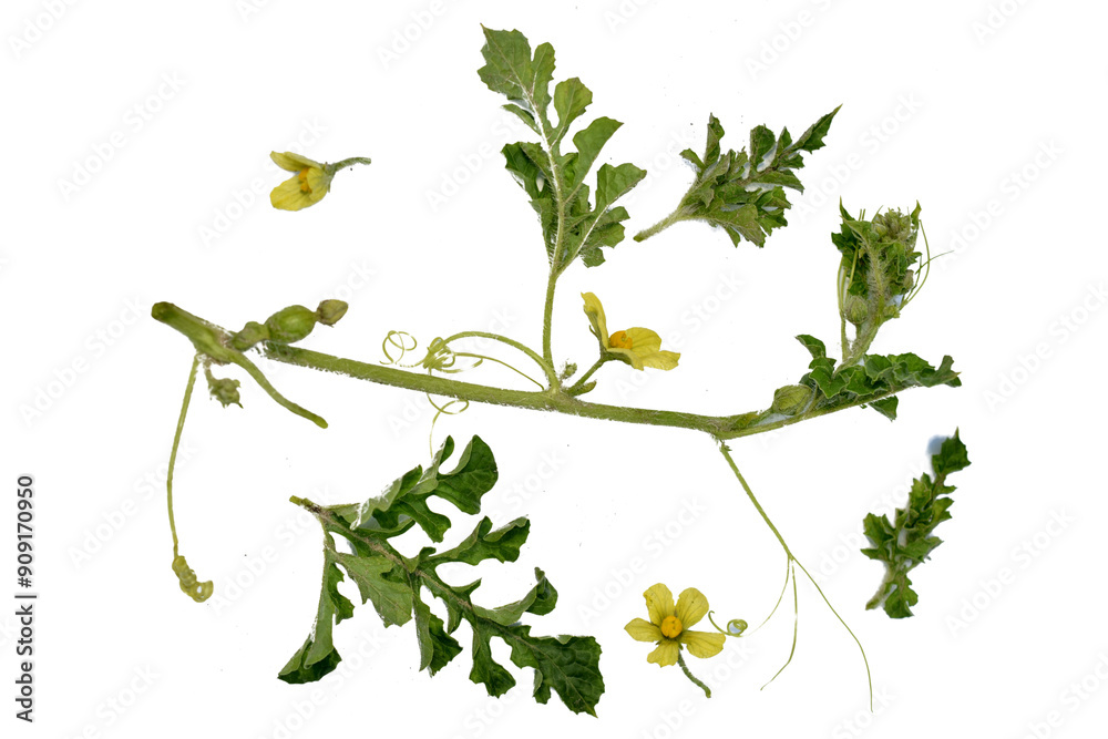 An isolated watermelon vine with yellow flowers and leaves lies on a white background. Herbarium.