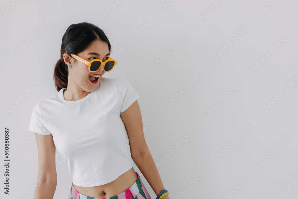 Wow and surprised face of asian Thai woman wear white top, colorful pants and orange sunglasses, chic and fashion, looking at empty space and standing isolated over white background wall.