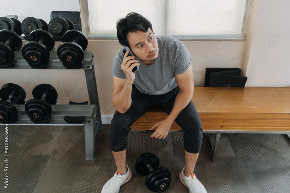 Asian Thai man sitting at gym, using and talking on mobile phone after done or between resting exercise, workout with dumbbells.