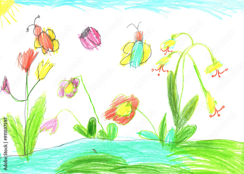 Child drawing butterfly and flowers nature. Pencil art in childish style