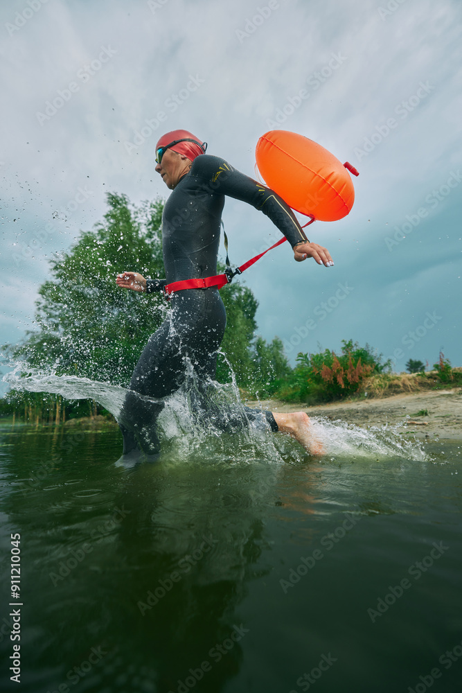 Athlete in wetsuit and swim cap splashes into lake with orange buoy attached, ready for swim amidst lush surroundings. Concept of sport competition, workout, recreation, healthy lifestyle.