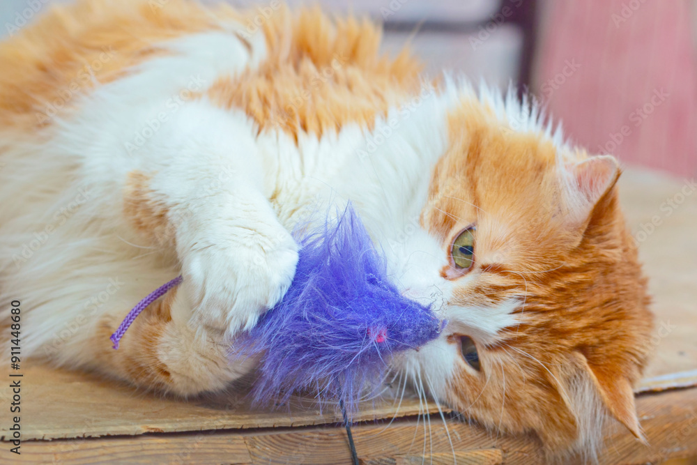 Adult cat with fluffy purple toy