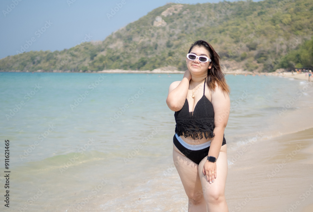 Portrait young asian woman fat chubby cute beautiful smile happy fun enjoy relax bikini swimwear body sexy front view sea beach white sand clean bluesky calm nature ocean wave water travel on holiday