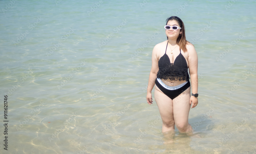 Portrait young asian woman fat chubby cute beautiful smile happy fun enjoy relax bikini swimwear body sexy front view sea beach white sand clean bluesky calm nature ocean wave water travel on holiday