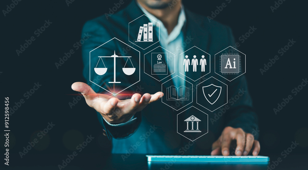 Justice and laws concept, Labor law, legal advice business, lawyer or notary working with compliance and regulations, AI law technology intellectual property and protection of copyright laws