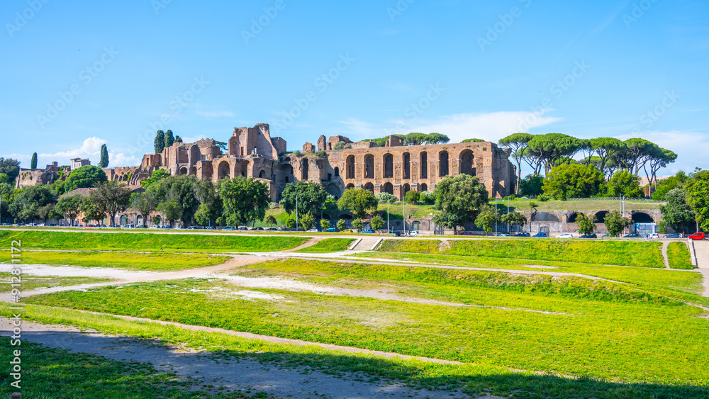 A view of the Domus Severiana ruins on Palatine Hill from Circus Maximus in Rome, Italy. The ancient Roman palace is visible in the distance, with a grassy area in the foreground.