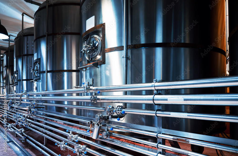 Modern brewery steel tanks and intricate piping, precision and quality in craft beer production.
