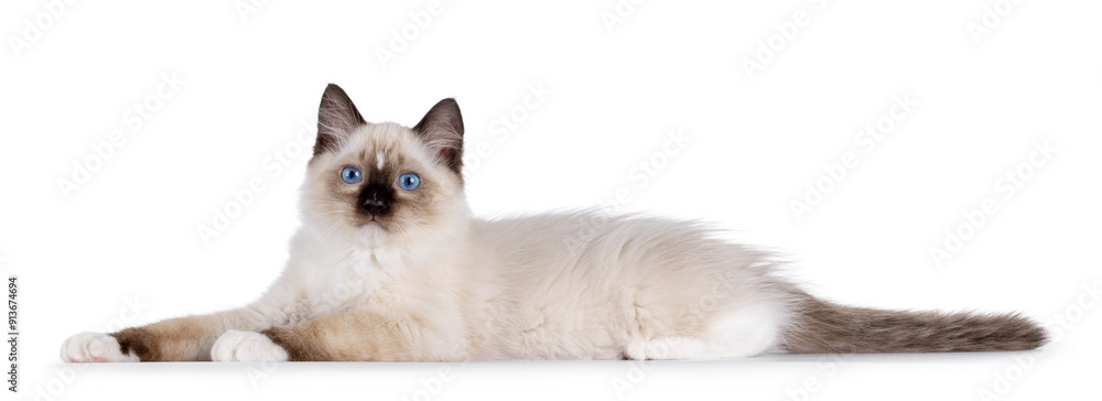 Cute Ragdoll cat kitten laying down side ways. Looking curious towards camera with breed typical blue eyes. Isolated on a white background.