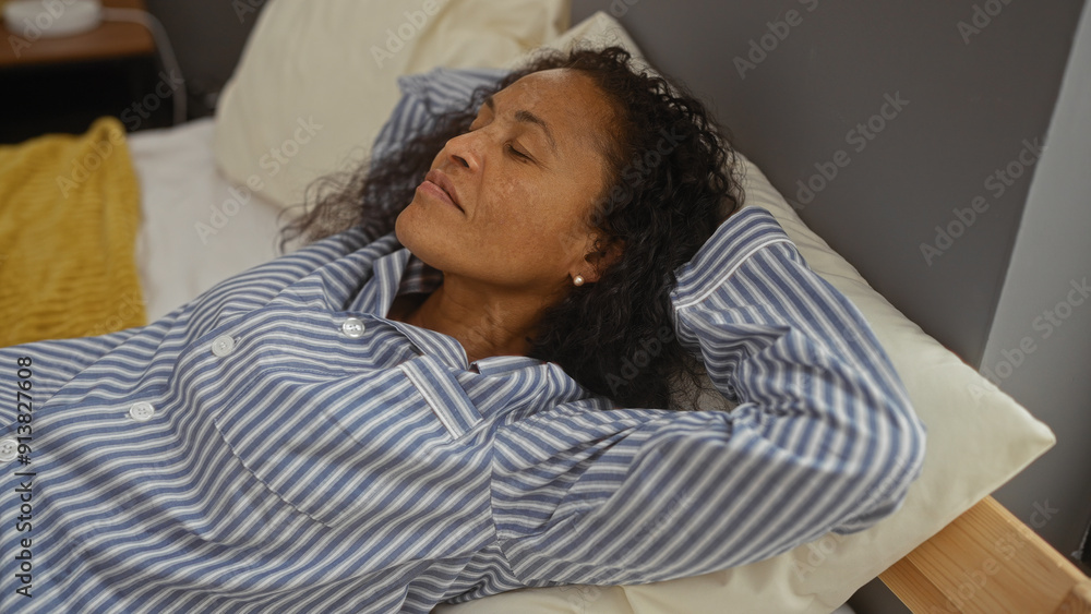 Woman relaxing indoors with eyes closed on bed in bedroom wearing striped pajamas