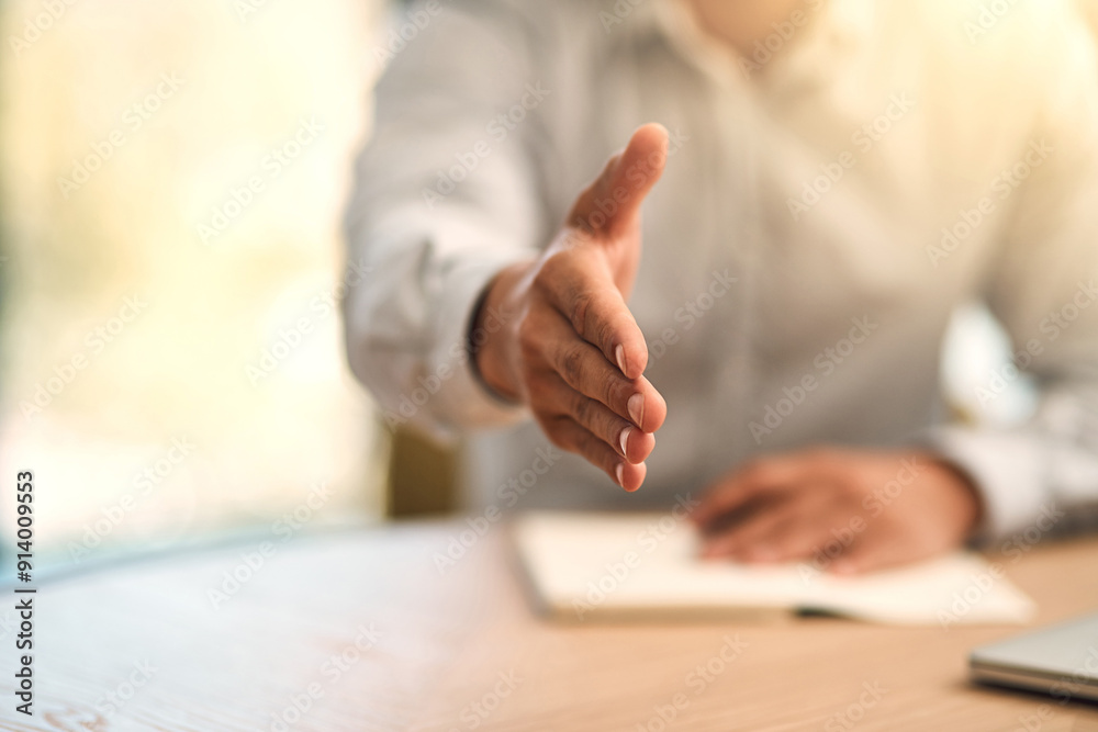 Open handshake, person and welcome to office with business expansion, thanks and hiring at agency. Manager, onboarding and human resources at job interview with recruitment, choice and introduction