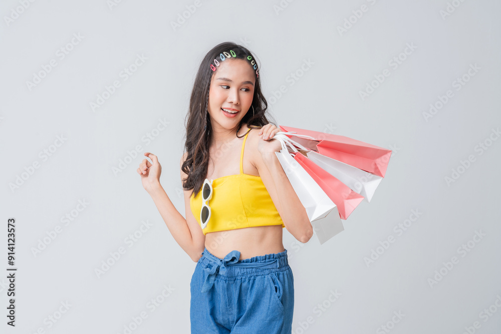 Asian happy female woman girl holds colourful shopping packages standing on plain background studio shot, Close up Portrait young beautiful attractive girl smiling hand hold colorful shopping bag