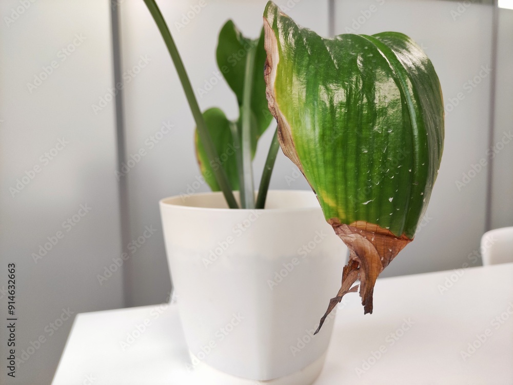 Yellowing spots on leaves on houseplant, close-up sick house plant