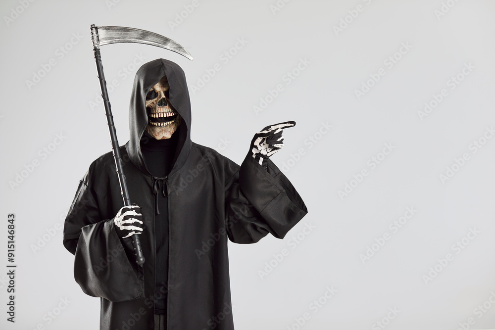 Male person in Halloween grim reaper death costume holding scythe in black cloak with hood pointing index finger to the side isolated on studio gray background. Halloween party and horror concept.