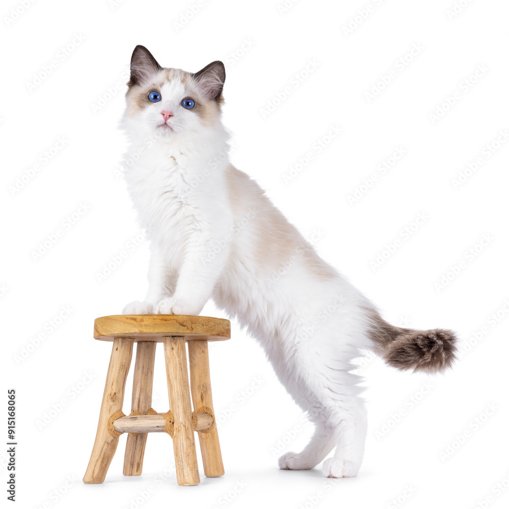 Expressive Ragdoll cat kitten, standing side ways. Looking towards camera with blue eyes. Isolated on a white background.